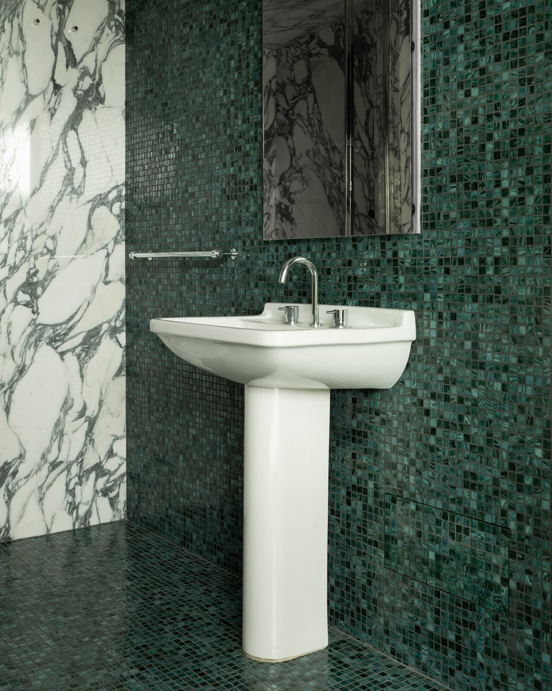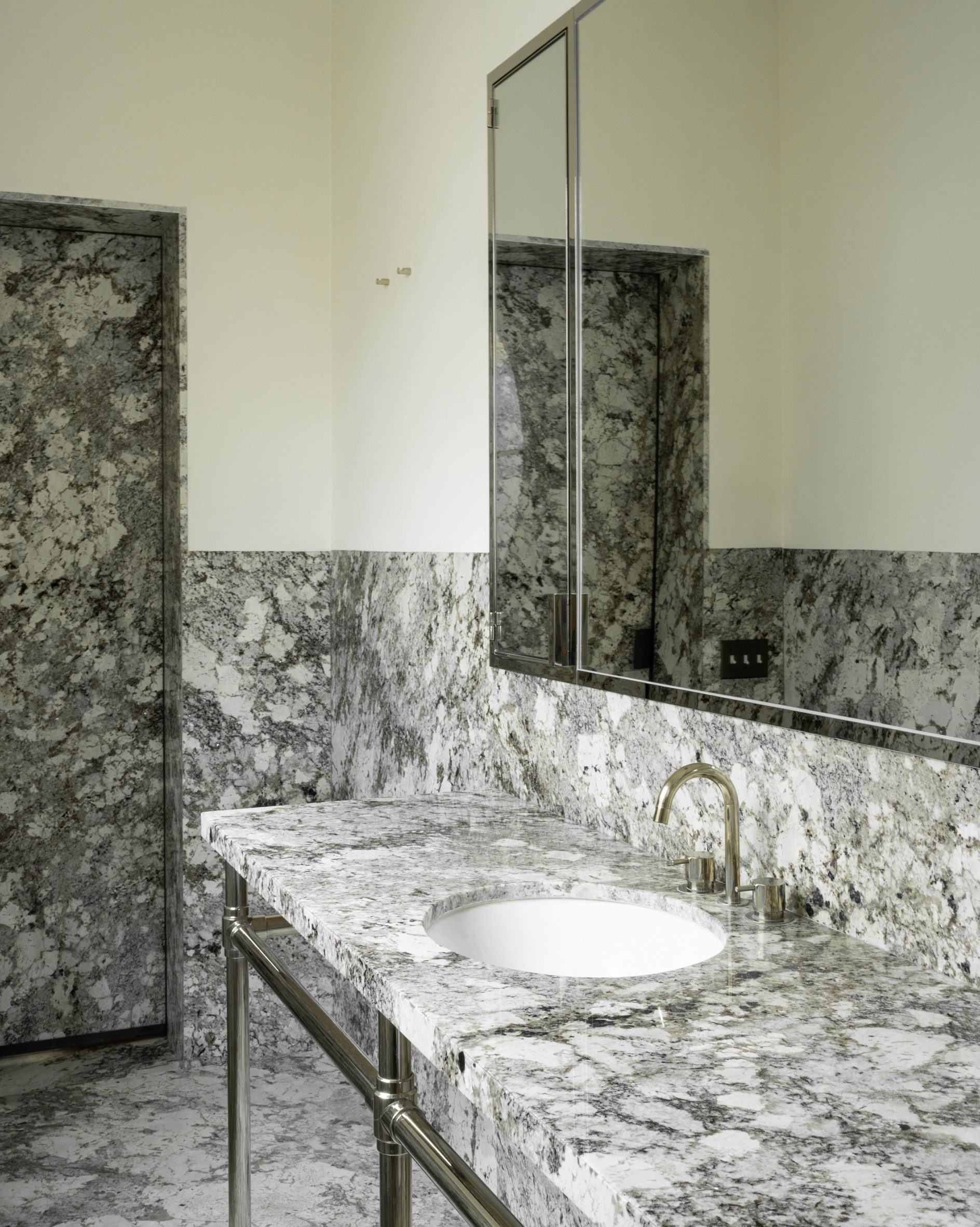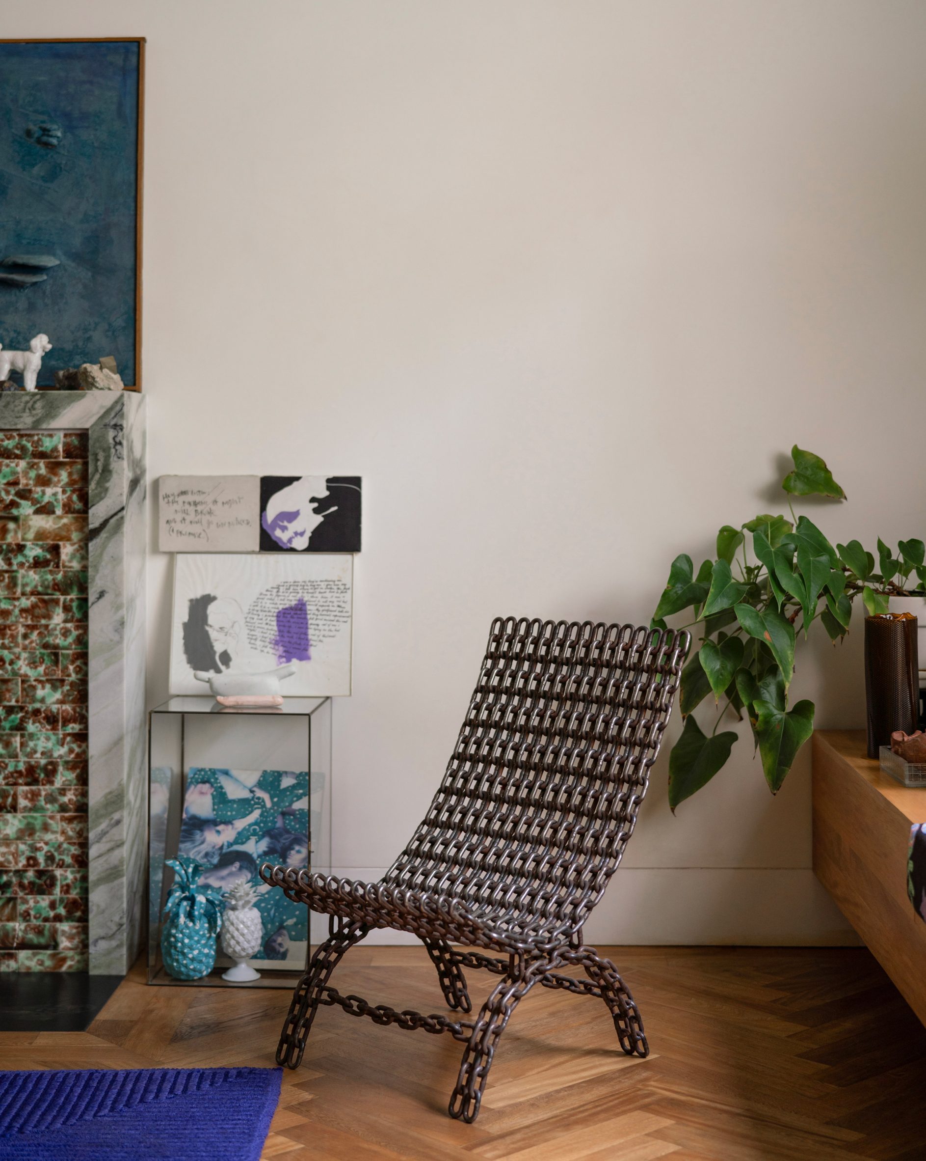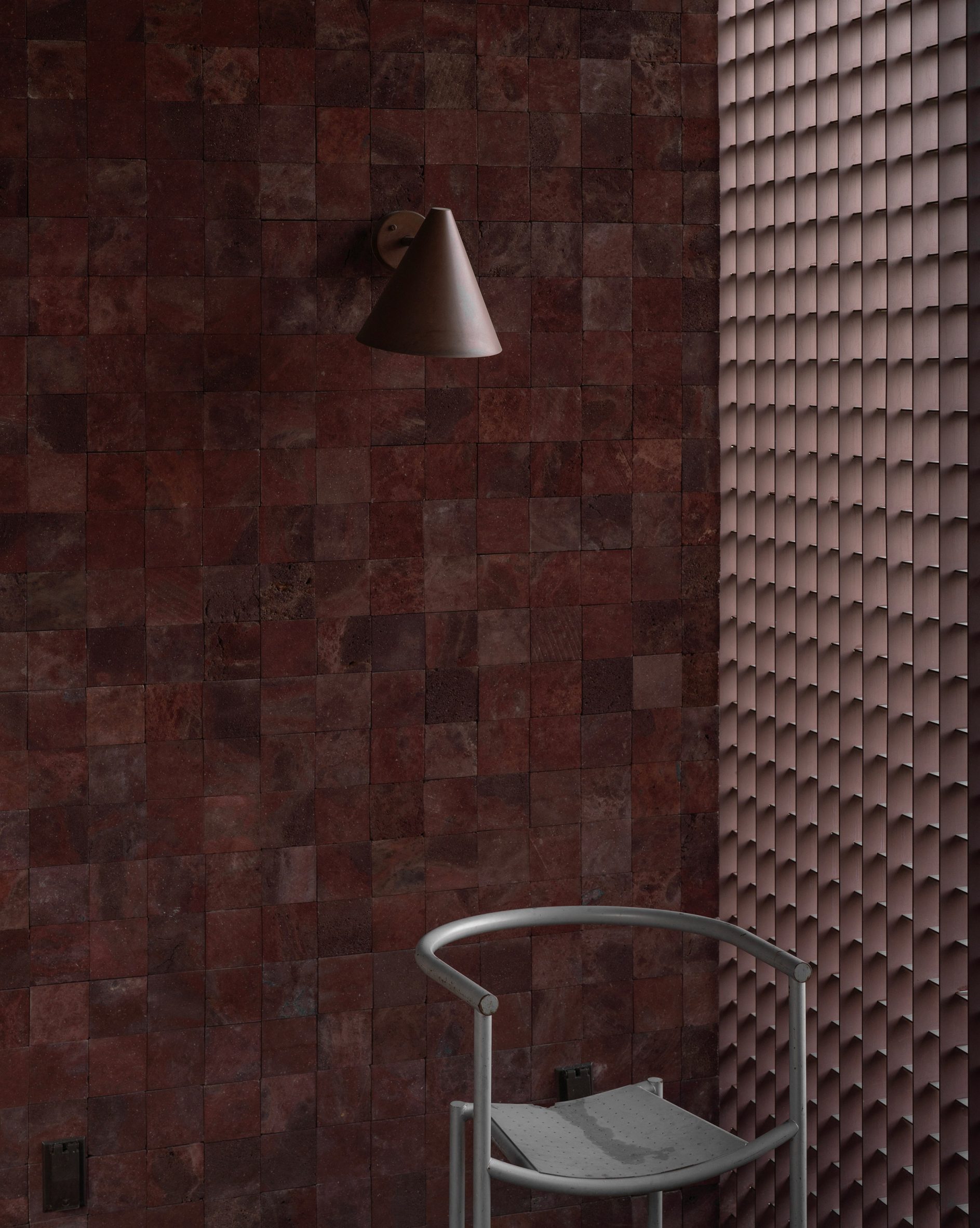 Η μεταλλική λεπτομέρεια παίζει πρωταγωνιστικό ρόλο. Κάγκελα, σκάλες και φεγγίτες έχουν βαφτεί σε απαλές, πουδρέ αποχρώσεις, σε μια σαφή αναφορά στις χρωματικές θεωρίες του Le Corbusier. Στο ισόγειο, ένα πράσινο terrazzo περιβάλλει τον κεντρικό χώρο φύτευσης, με τροπικά φυτά να αναπτύσσονται τόσο στο έδαφος όσο και σε επιτοίχιες ζαρντινιέρες που ανεβαίνουν προς τα πάνω επίπεδα.