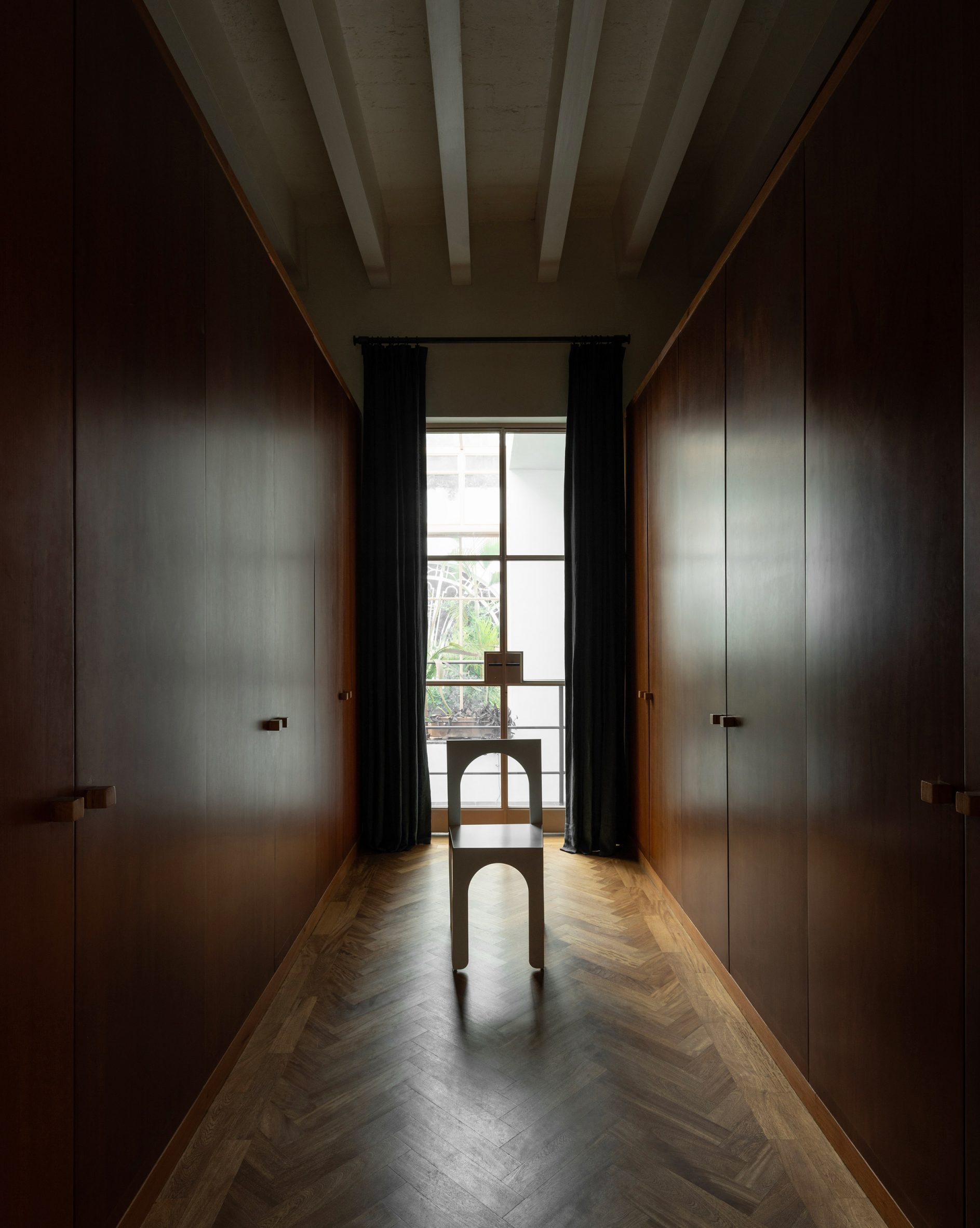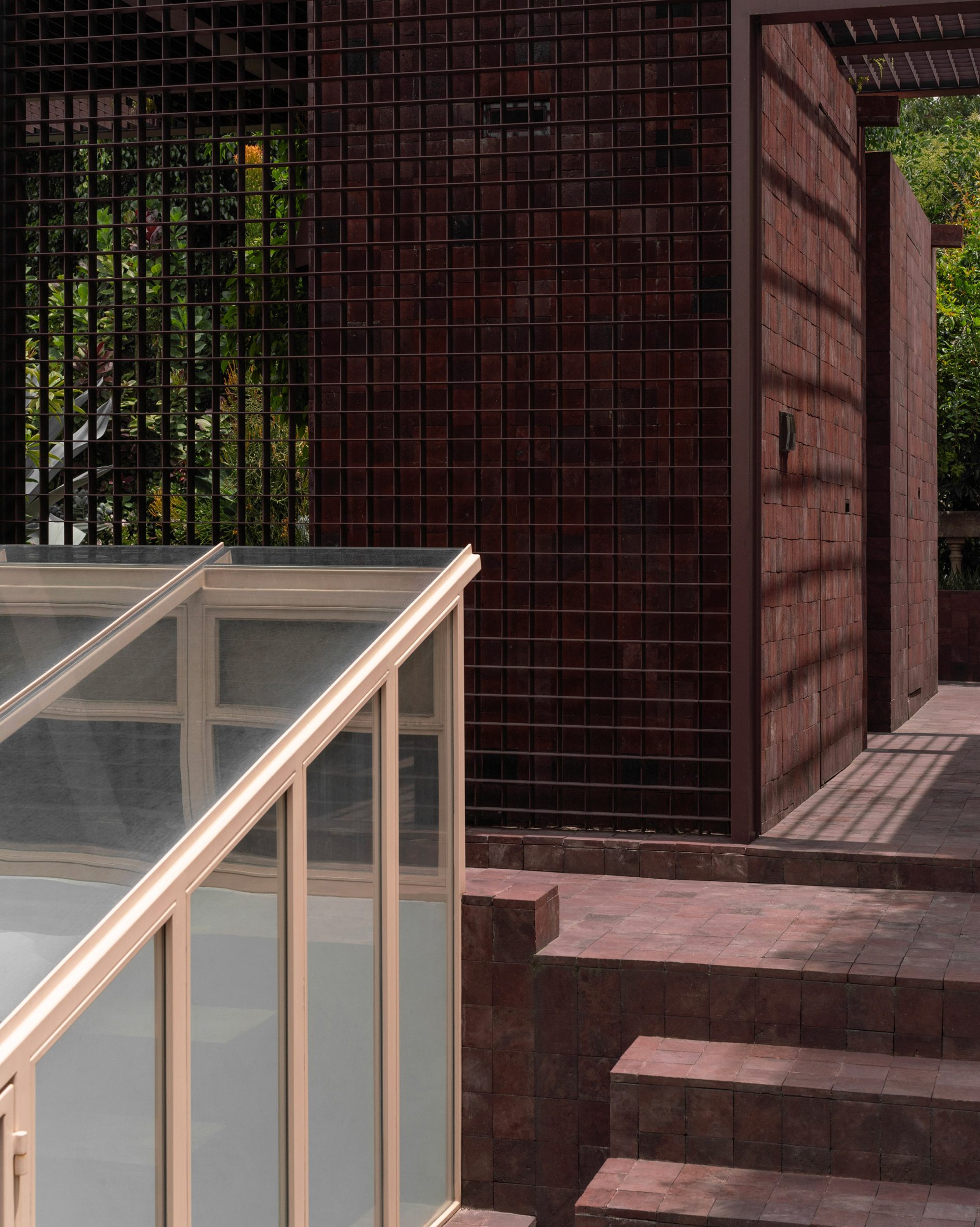 Ο χώρος οργανώνεται γύρω από ένα τριώροφο αίθριο, γεμάτο φως και φυτεύσεις, που λειτουργεί ως ο πραγματικός πυρήνας της κατοικίας. Φεγγίτες στην οροφή επιτρέπουν στο φυσικό φως να διαχέεται κατακόρυφα, ενώ γαλλικές πόρτες με μεταλλικά πλαίσια σε ροδακινί αποχρώσεις το μεταφέρουν οριζόντια στους γύρω χώρους. Στα ανώτερα επίπεδα, υαλοστάσια με φριταρισμένο γυαλί εξασφαλίζουν ιδιωτικότητα χωρίς να περιορίζουν το φυσικό φως.