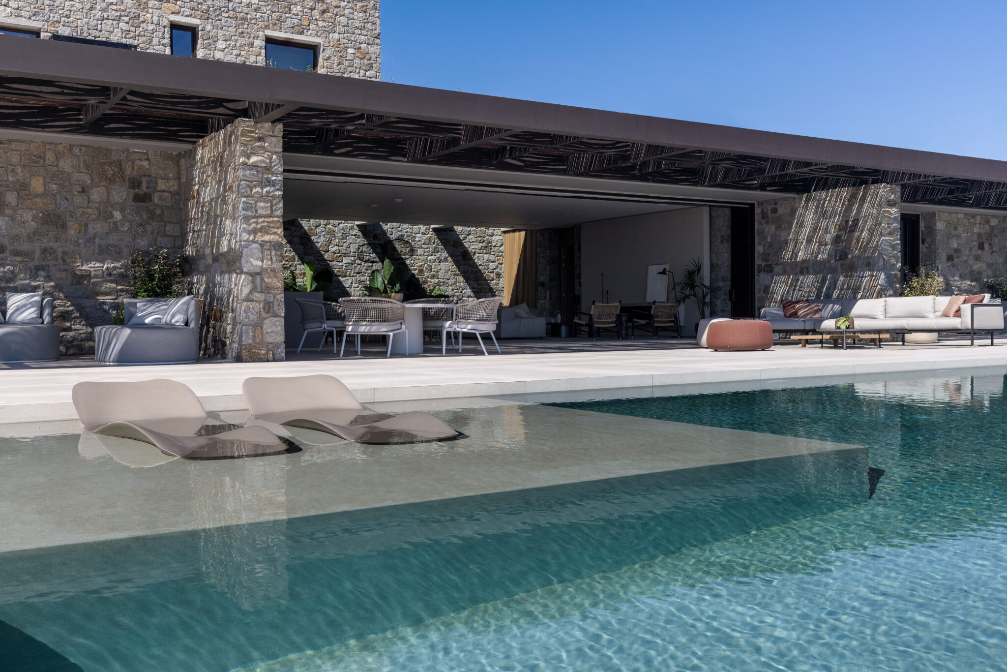 Φυσικά υλικά, όπως η πέτρα και το ξύλο Μεράντι, χρησιμοποιούνται σε πλήρη αρμονία με τον περιβάλλοντα χώρο και την τοπική παράδοση, ενώ η επιβλητική ξύλινη πέργκολα μήκους σαράντα μέτρων, τονίζει τη γραμμικότητα της αρχιτεκτονικής χειρονομίας και παρέχει σκιά στους παρακείμενους χώρους. Την ίδια στιγμή, το στέγαστρο επιτρέπει τη δημιουργία προστατευμένων περιοχών που μοιάζουν με «φωλιές», όπως το υπαίθριο barbecue που διαθέτει πλήρως εξοπλισμένη κουζίνα και τραπεζαρία με θέα στη θάλασσα.