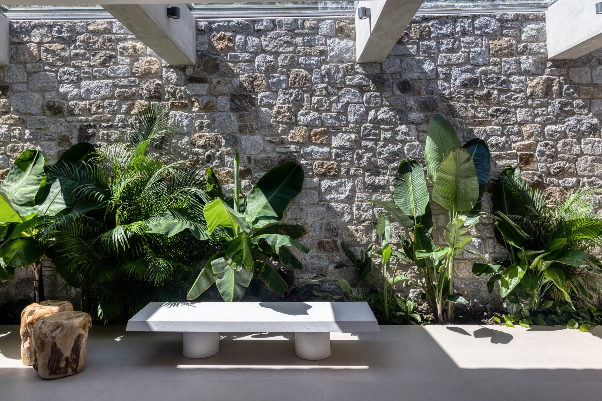 Το ρευστό όριο ανάμεσα στην αρχιτεκτονική και την υπαίθρια διαβίωση ενισχύεται ακόμη περισσότερο μέσω της χρήσης εσωτερικών αυλών με τροπική βλάστηση που χωροθετούνται στο πίσω μέρος και προσφέρουν διαμπερή αερισμό και σύνδεση με τη φύση.