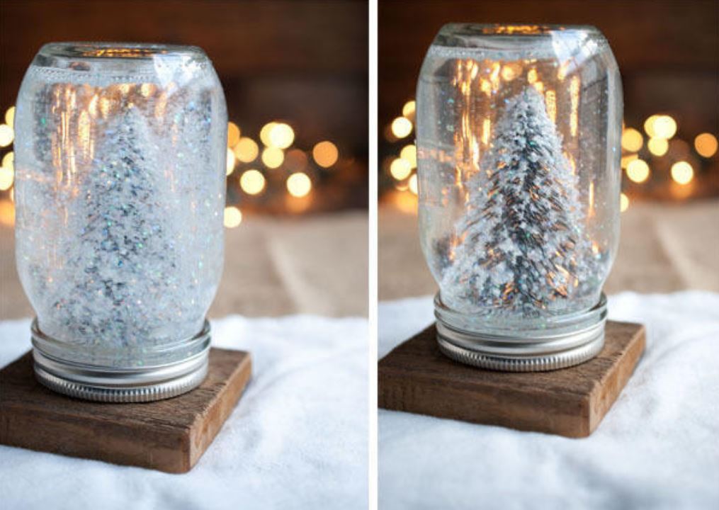 Η πιο κλασσική και όμορφη χριστουγεννιάτικη κατασκευή είναι αυτή που μας επιτάσσει να φτιάξουμε γιορτινές χιονόμπαλες. Σε ένα άδειο βάζο, γυρισμένο ανάποδα, βάλτε μικρά στολίδια ή μικρά έλατα, νερό και χρυσόσκονη. Στη συνέχεια, αφήστε τη μαγεία να σας ταξιδέψει!
