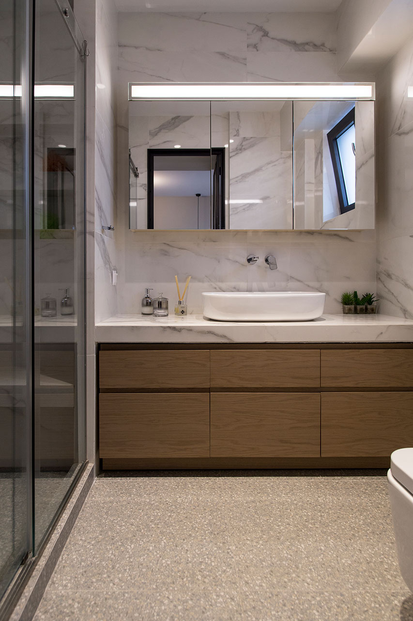 Τα υλικά συνδυάζονται μεταξύ τους αρμονικά ενώ οι αντιθέσεις χρησιμοποιούνται για να οριοθετήσουν τις χρήσεις των χώρων. Το υλικό του δαπέδου φυσικός δρυς τοποθετημένο σε διάταξη «ψαροκόκκαλου» καλύπτει το μεγαλύτερο μέρος του διαμερίσματος. Στα υπνοδωμάτια, το υλικό του δαπέδου που είναι φυσικός δρυς όπως και στο σαλόνι αλλάζει διάταξη και είναι τοποθετημένο σε οριζόντια κατεύθυνση. Στον σχεδιασμό του master bedroom εναλλάσσονται τα ίδια υλικά, ως συνέχεια του καθιστικού, συνδυάζοντας ξύλινα και μαύρα στοιχεία που διακόπτονται απο τον λευκό όγκο της γκαρνταρόμπας.