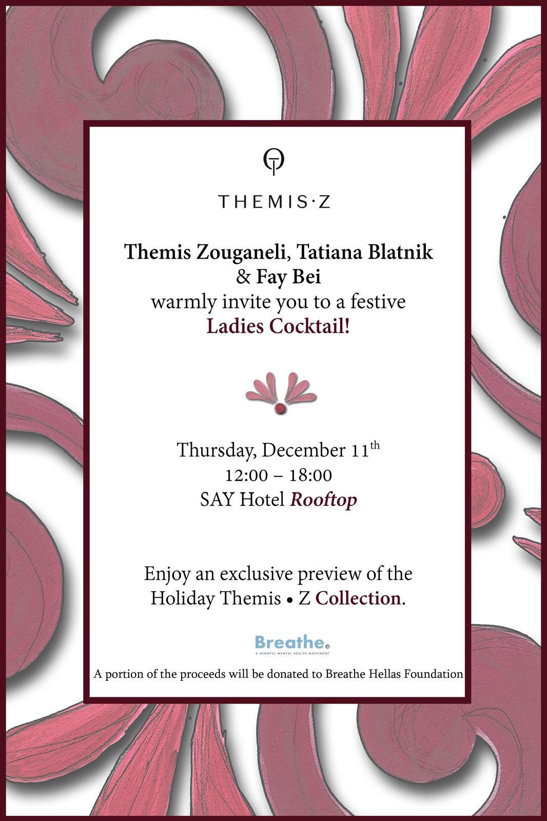 Από τίς 12.00 μέχρι τις 18.00 την Πέμπτη 11 Δεκεμβρίου, στο Rooftop του SAY Hotel, στην Κηφισιά, Χαριλάου Τρικούπη 67 θα απολαύσουμε τα κοκτέιλ μας ενώ θα έχουμε την ευκαιρία να θαυμάσουμε μια αποκλειστική preview της Holiday Collection δια χειρός Themis Z.