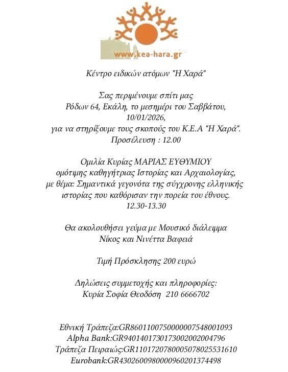 Το αγαπητό αυτό ζευγάρι καλεί στο σπίτι τους, το Σάββατο 10 Ιανουαρίου 2026 στις 12 το μεσημέρι όσους ενδιαφέρονται να στηρίξουν το ΚΕΥ ‘Χαρά’ και να παρακολουθήσουν την ομιλία της Κυρίας Μαρίας Ευθυμίου, ομότιμης καθηγήτριας Ιστορίας και Αρχαιολογίας με θέμα: Σημαντικά γεγονότα της σύγχρονης ελληνικής ιστορίας που καθόρισαν την πορεία του έθνους.