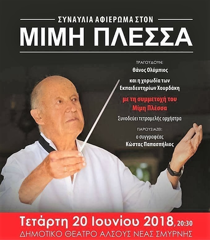 Την Τετάρτη 20 Ιουνίου 2018 και ώρα 20:30 στο Δημοτικό Θέατρο Άλσους Νέας Σμύρνης θα πραγματοποιηθεί η τιμητική συναυλία αφιέρωμα στον Μίμη Πλέσσα όπου θα τραγουδήσουν ο στενός συνεργάτης του κορυφαίου συνθέτη Θάνος Ολύμπιος και η χορωδία των Εκπαιδευτηρίων Χουρδάκη υπό την συνοδεία τετραμελούς ορχήστρας.