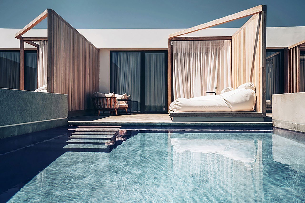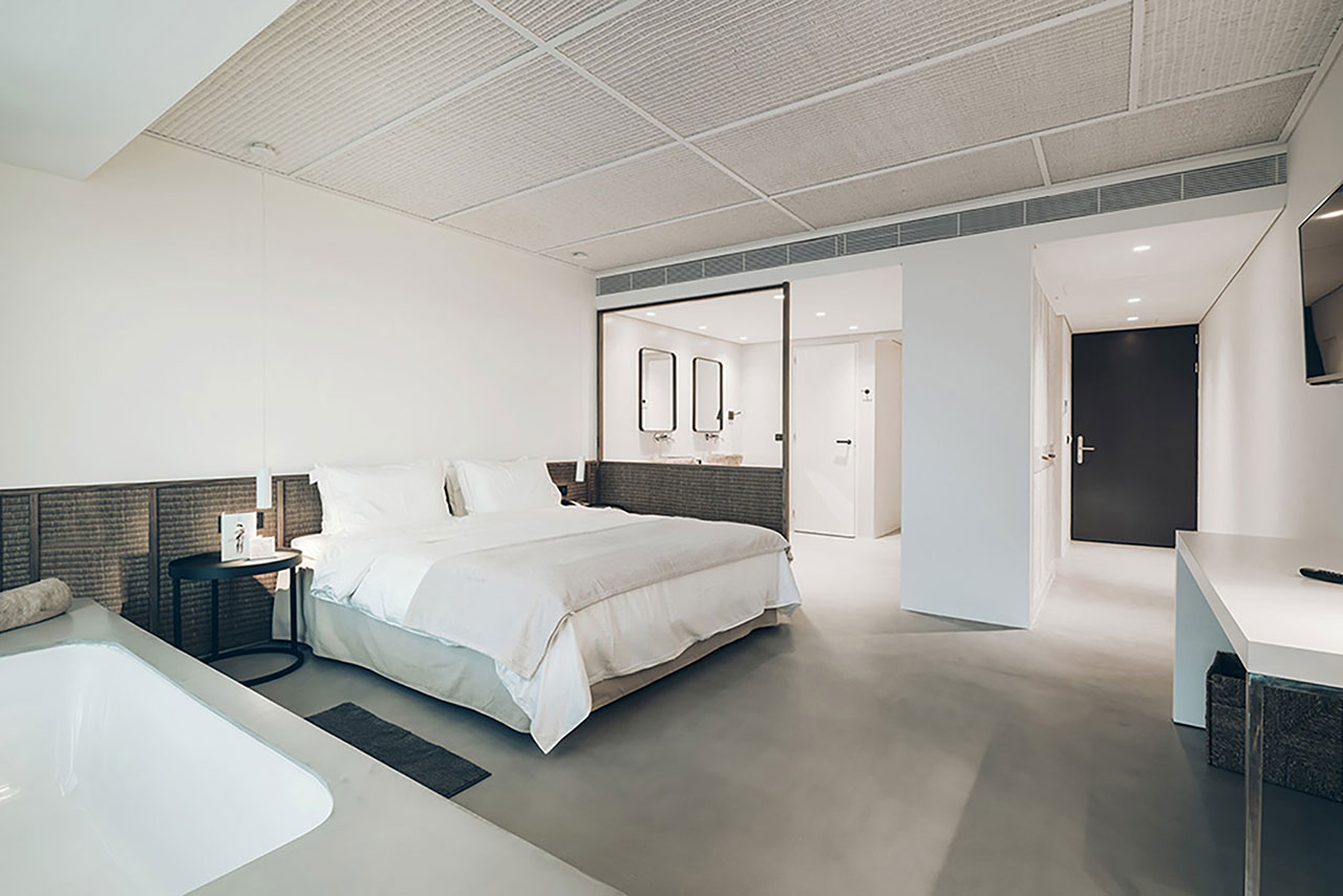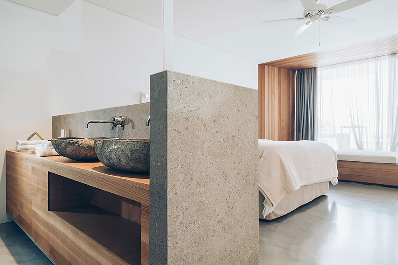 Η υπόλοιπη διαμόρφωση σχηματίζεται σταδιακά σε αυξανόμενες στάθμες πάνω στην πλαγιά του λόφου, επιτρέποντας κάθε φορά να σχηματιστούν δωμάτια private pool και sharing pool, τα οποία έχουν ανεμπόδιστη θέα προς τη θάλασσα, στοιχείο που εντείνεται με το σχεδιασμό της infinity πισίνας.