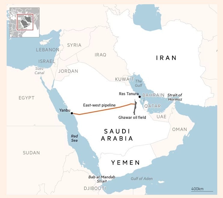 Θεωρητικά, πλοία που φορτώνουν στη δυτική Σαουδική Αραβία θα μπορούσαν να πλεύσουν βόρεια μέσω της Διώρυγας του Σουέζ, αλλά αυτό θα πρόσθετε εβδομάδες στον χρόνο ταξιδιού – και σημαντικό κόστος – για τις διαδρομές προς την Ασία.