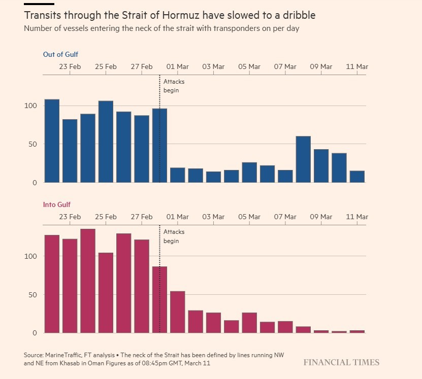 Τα ταξίδια αυτά πραγματοποιούνται μετά από τα ιρανικά πλήγματα σε πλοία και υποδομές που προκάλεσαν σχεδόν πλήρη διακοπή της κυκλοφορίας στα Στενά του Ορμούζ, το στενό θαλάσσιο πέρασμα μέσω του οποίου διέρχονταν σχεδόν όλες οι εξαγωγές πετρελαίου του Κόλπου πριν από τον πόλεμο.