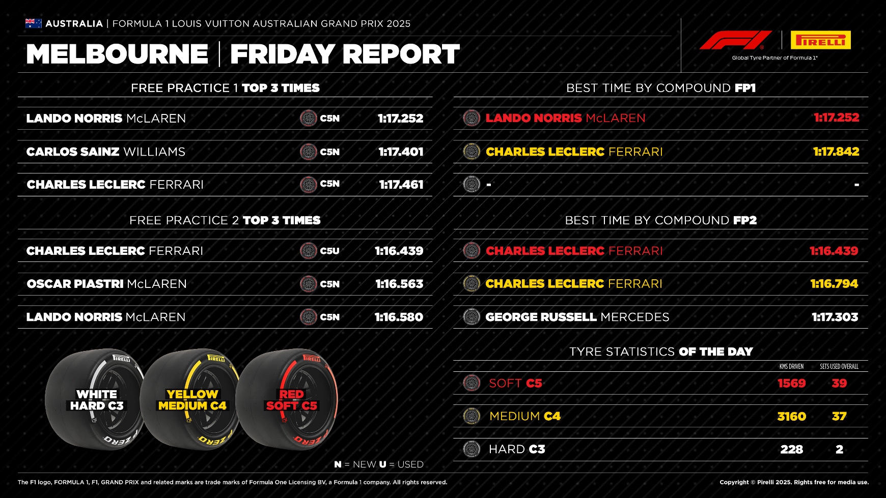 Έχει περάσει σχεδόν ένας χρόνος από το Grand Prix Αυστραλίας του 2024 (ήταν ο 3ος αγώνας πέρυσι), αλλά το αποτέλεσμα της πρώτης ημέρας των ελεύθερων δοκιμών παρέμεινε ίδιο, με τον Λάντο Νόρις να είναι ο ταχύτερος στην FP1 και τον Σαρλ Λεκλέρ συνολικά ταχύτερος.