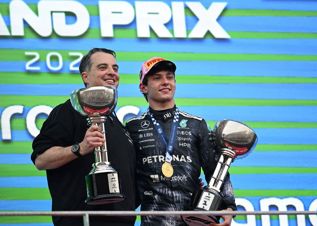 Ο νικητής Κίμι Αντονέλι με τον επικεφαλής μηχανικό της Mercedes Τζιάκομο Τορτόρα που ανέβηκε στο βάθρο για να πάρει το τρόπαιο του κατασκευαστή.