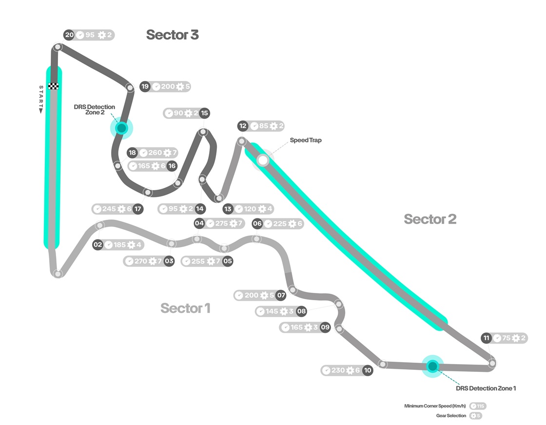 Το Circuit of the America’s έχει μήκος 5513m και 20 στροφές, μερικές εκ των οποίων πολύ γρήγορες. Υπάρχουν δυο μεγάλες ευθείες με αντίστοιχες ζώνες DRS. Το πιο χαρακτηριστικό σημείο της διαδρομής είναι η πρώτη στροφή, με έντονη ανωφέρεια και μεγάλο πλάτος. Καταλήγει σε μια αριστερή στροφή 120 μοιρών όπου οι οδηγοί διεκδικούν θέση. Η ποικιλία των στροφών απαιτεί μια ευέλικτη ρύθμιση του μονοθεσίου που μπορεί να προσφέρει υψηλή τελική ταχύτητα εξασφαλίζοντας παράλληλα σταθερότητα στα πιο τεχνικά τμήματα. Η φθορά των ελαστικών είναι ισορροπημένη μεταξύ του εμπρός και του πίσω άξονα. Οι πλευρικές δυνάμεις είναι μεγαλύτερες από τις διαμήκεις λόγω των πολλών στροφών υψηλής ταχύτητας και των γρήγορων αλλαγών κατεύθυνσης. Η πτώση απόδοσης των ελαστικών προέρχεται από τη θερμική καταπόνηση. Επηρεάζεται επίσης από τη θερμοκρασία περιβάλλοντος, η οποία μπορεί να είναι ακόμα αρκετά υψηλή στο Τέξας τον Οκτώβριο. Πέρυσι, κατά τη διάρκεια του αγώνα, ο υδράργυρος ανέβηκε πάνω από τους 30°C και αναμένεται να είναι παρόμοια και φέτος. Η πίστα ασφαλτοστρώθηκε εκ νέου σε κάποια σημεία πέρυσι, γεγονός που την έκανε πιο ομαλή σε σχέση με το παρελθόν, αμβλύνοντας τις ανομοιομορφίες.