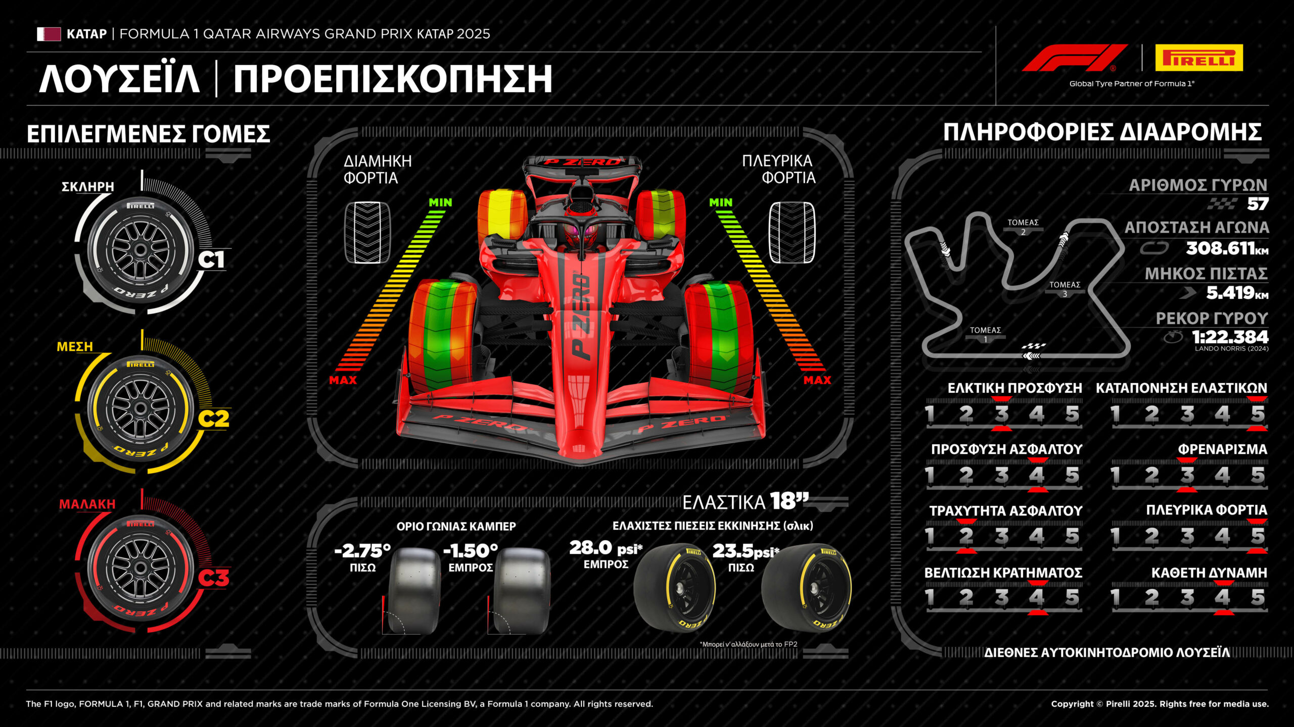 Οι τρεις πιο σκληρές γόμες της σειράς της Pirelli επιλέχθηκαν για τη Ντόχα. Οι C1, C2 και C3 αποτελούν την προφανή επιλογή σε μια πίστα όπου τα ελαστικά υπόκεινται σε επίπεδα ενέργειας παρόμοια με αυτά στη Σουζούκα. Είναι οι μόνες γόμες που έχουν χρησιμοποιηθεί ποτέ για αυτό το Grand Prix. Αυτό το τρίο γομών έχει χρησιμοποιηθεί στο παρελθόν τρεις φορές φέτος, όλες στο πρώτο μέρος της σεζόν, στην Ιαπωνία, στο Μπαχρέιν και στην Ισπανία. Οι περισσότερες στροφές στην πίστα της Λουσέιλ είναι υψηλής ταχύτητας, πράγμα που σημαίνει ότι τα ελαστικά έχουν ελάχιστο χρόνο να ανακάμψουν και το τμήμα που τα καταπονεί περισσότερο είναι από τη στροφή 12 έως τη 14. Η επιφάνεια της πίστας, η οποία είναι αρκετά λεία, προκαλεί συνήθως τοπική παραμόρφωση λόγω υπερθέρμανσης (graining), που συμβάλλει στην παραγωγή υψηλού ρυθμού φθοράς στα ελαστικά.