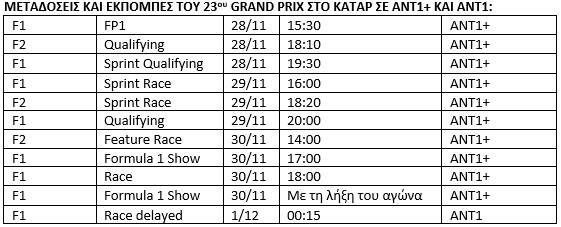Στην εκπομπή «Formula 1 Show», που ξεκινά στις 17:00, μία ώρα πριν την απευθείας μετάδοση του αγώνα, αποκλειστικά από το ΑΝΤ1+, ο απεσταλμένος στο Κατάρ, Πάνος Σεϊτανίδης, θα μεταφέρει το παρασκήνιο, το κλίμα από τα paddock και όσα δεν καταγράφουν οι κάμερες στον αγωνιστικό χώρο. Θα παρακολουθήσουμε ακόμα αποκλειστική συνέντευξη του Ντέιβιντ Κούλθαρντ, τη συναρπαστική εμπειρία ενός hot lap με οδηγό τον Βάλτερι Μπότας, καθώς και τις δηλώσεις που έκαναν στην κάμερα του ΑΝΤ1 οι δεκάδες celebrities που παρέλασαν στο κόκκινο χαλί που είχε στηθεί στα paddock του Las Vegas.