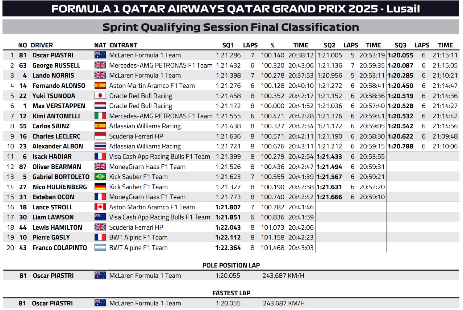 Ο Όσκαρ Πιάστρι ήταν ταχύτερος σήμερα τόσο στην μοναδική περίοδο ελεύθερων δοκιμών όσο και στις κατατακτήριες δοκιμές του Sprint.
