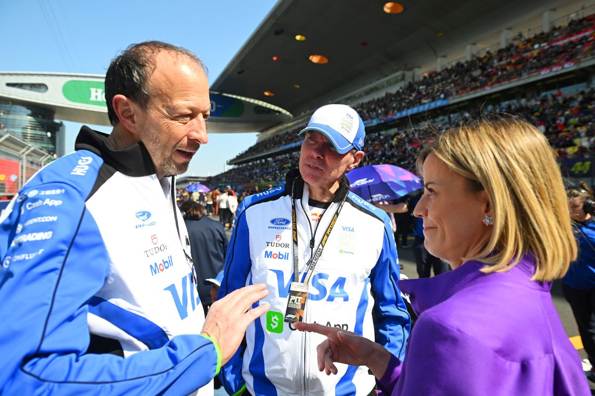 Η επικεφαλής της F1 Academy, Σούζι Βολφ στο grid με τους Πήτερ Μπάγιερ (CEO) και Αλάν Περμάν (αγωνιστικός διευθυντή) των Racing Bulls.