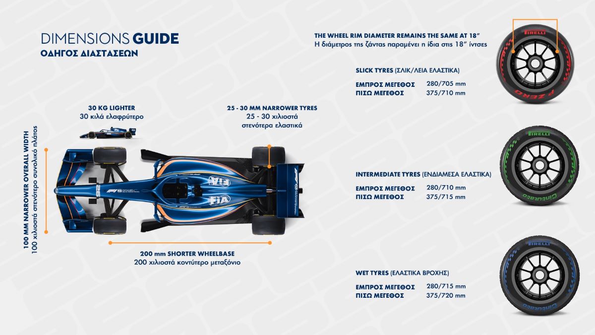 Τα μονοθέσια είναι πιο κοντά, πιο στενά, πιο ελαφριά και πιο ευέλικτα. Το μεταξόνιο έχει μειωθεί, γεγονός που θεωρητικά σημαίνει ότι θα ανταποκρίνονται πιο άμεσα στις στροφές. Τα μονοθέσια θα εξακολουθούν να είναι εξοπλισμένα με ελαστικά Pirelli 18 ιντσών, αλλά τα ελαστικά αυτά είναι στενότερα. Αυτό θα μειώσει τις αεροδυναμικές αντιστάσεις (drag) και θα αφαιρέσει λίγο ακόμη βάρος. Επίσης, οι μορφοποιητές αέρα πάνω από τα μπροστινά ελαστικά καταργούνται, γεγονός που κάνει τα μονοθέσια πιο «καθαρά» και ακόμη ελαφρύτερα. Όσον αφορά στο πάτωμα, καταργούνται τα μεγάλα κανάλια του ground-effect. Πλέον υπάρχει επίπεδο πάτωμα ενώ ο διαχύτης έχει μεγαλύτερα ανοίγματα. Αυτό σημαίνει λιγότερη κάθετη δύναμη (downforce) από το πάτωμα και μεγαλύτερη απόσταση από το έδαφος, κάτι που αναμένεται να επιτρέψει μεγαλύτερη ποικιλία ρυθμίσεων (set-ups) που ταιριάζουν σε διαφορετικά στυλ οδήγησης – εντείνοντας έτσι το πεδίο του ανταγωνισμού.