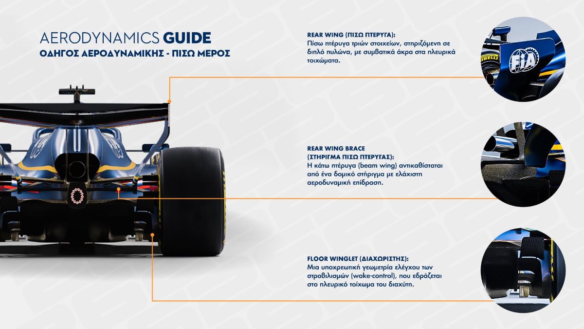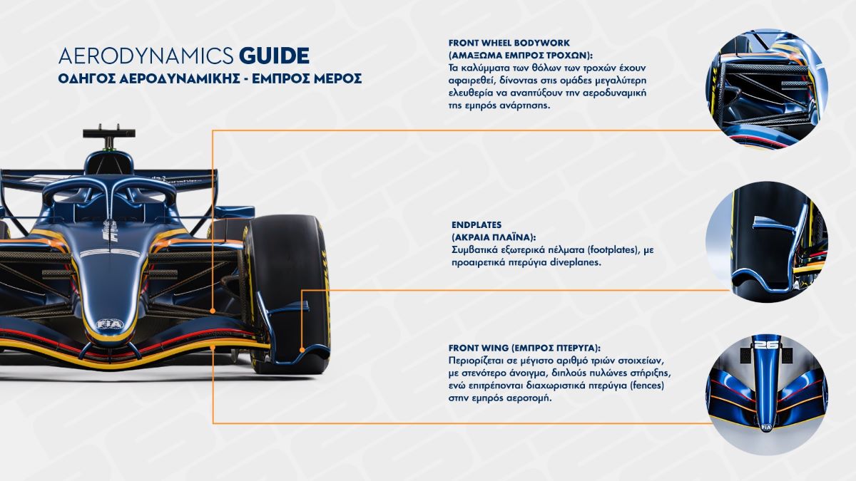 Τόσο η εμπρός όσο και η πίσω πτέρυγα θα είναι απλούστερες, με λιγότερα στοιχεία. Τα πίσω «beam wings» καταργούνται, ενώ στο μπροστινό μέρος η πτέρυγα θα έχει στενότερα στοιχεία. Τα εξωτερικά τμήματα της εμπρός πτέρυγας θα προσφέρουν επίσης νέες περιοχές ανάπτυξης, κάτι που θα αποτελέσει κρίσιμο πεδίο μάχης για τις ομάδες, καθώς η εμπρός πτέρυγα επηρεάζει σημαντικά τη συνολική αεροδυναμική απόδοση.
