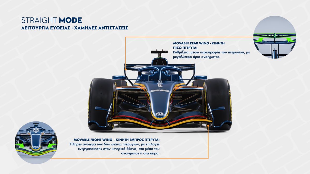 Η πιο σημαντική αλλαγή είναι η εισαγωγή κινητών αεροδυναμικών βοηθημάτων. Τα μονοθέσια θα μπορούν να ρυθμίζουν τη γωνία των στοιχείων τόσο της εμπρός όσο και της πίσω πτέρυγας, ανάλογα με το πού βρίσκονται στην πίστα. Στις στροφές, τα πτερύγια παραμένουν κλειστά στην προεπιλεγμένη τους θέση για να παράγουν κάθετη δύναμη ώστε να διατηρούν την πρόσφυση.