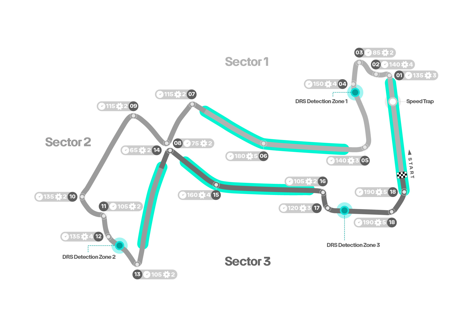 Η μέση και η σκληρή γόμα θα είναι σαφώς επιλογές για τον αγώνα. Η μαλακή θα μπορούσε να χρησιμοποιηθεί από οποιονδήποτε οδηγό θέλει να εκμεταλλευτεί στο έπακρο την επιπλέον πρόσφυση που προσφέρει στην εκκίνηση, ή αν υπάρξει περίοδος αυτοκινήτου ασφαλείας προς το τέλος του αγώνα. Οι τροποποιήσεις που έγιναν στη διάταξη της πίστας πριν από μερικά χρόνια διεκολύνουν λίγο τις προσπεράσεις, αν και προφανώς, εξακολουθεί να είναι μάλλον δύσκολο να περάσεις ένα άλλο μονοθέσιο. Ως εκ τούτου, η δυνατότητα αξιοποίησης της μεγάλης διαφοράς απόδοσης μεταξύ των φρέσκων μαλακών ελαστικών και ελαστικών μέσης ή σκληρής γόμας που έχουν κάνει πολλούς γύρους, είναι ένας παράγοντας που πρέπει να ληφθεί υπόψη.