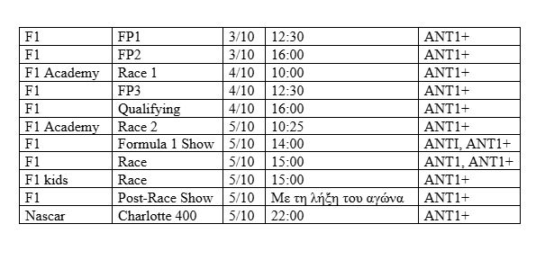 Στην παρουσίαση του «Formula 1 Show», που ξεκινά στις 14:00, μια ώρα πριν την απευθείας μετάδοση του αγώνα θα βρίσκονται οι Μαρία Θωμά, Τάκης Πουρναράκης και Πάνος Σεϊτανίδης με καλεσμένο τον Γιάννη Αϊβάζη. Δείτε μεταξύ άλλων μια αποκλειστική συνέντευξη της Ιταλίδας παρουσιάστριας και οδηγού αγώνων Christine GZ. Ο Λωρέντ Μεκίς μιλά στην κάμερα του ΑΝΤ1 για την αλλαγή στρατηγικής της RBR ενώ ο Χάμιλτον θρηνεί για την απώλεια του σκύλου του. Αγώνας υποστήριξης στη Σιγκαπούρη θα είναι το F1 Academy. Την προσπάθεια των νεαρών αθλητριών θα περιγράψουν οι Μαρία Ανδρεάδη, Κώστας Λεώνης. Ταυτόχρονα θα υπάρχει για τους μικρούς μας φίλους και μετάδοση F1 Kids με διαφορετικά γραφικά ειδικά για παιδιά σε περιγραφή Μαρίας Ανδρεάδη και Θοδωρή Κοτιόνη. Στις μεταδόσεις της F1, θα βρίσκονται οι Μαρία Ανδρεάδη, Γιώργος Ανανίδας, Κώστας Λεώνης Τάκης Πουρναράκης, Πάνος Σεϊτανίδης.
