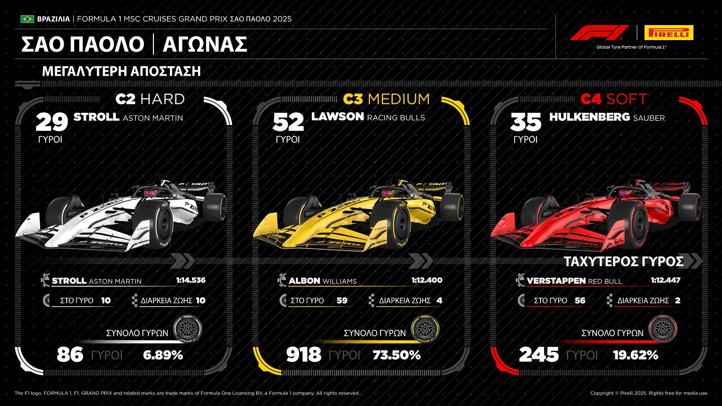 Ο Φερστάπεν εκκίνησε με σκληρή γόμα, είχε κλατάρισμα και έβαλε τη μέση γόμα στον 7ο γύρο. Χάρη στον αποκλεισμό του από το Q1 είχε και ένα φρέσκο σετ μαλακής γόμας. Πήγε μ’ αυτό το σετ για 27 γύρους και στον 34ο γύρο έβαλε ένα ακόμη σετ μέσης γόμας. Θεωρητικά μπορούσε να φτάσει μ’ αυτό ως το τέλος.