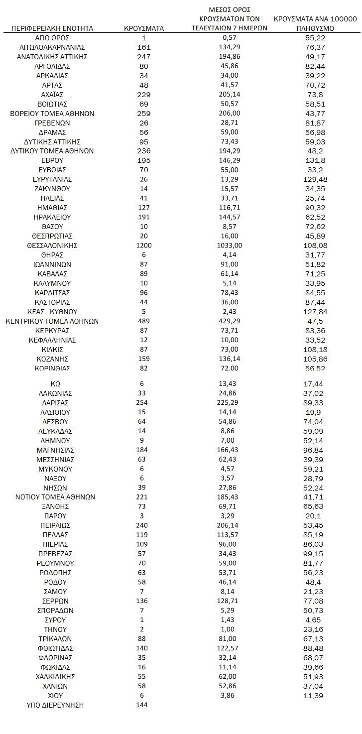 Η κατανομή των 7.089 νέων εγχώριων κρουσμάτων ανά Περιφερειακή Ενότητα παρουσιάζεται στον κατωτέρω πίνακα.