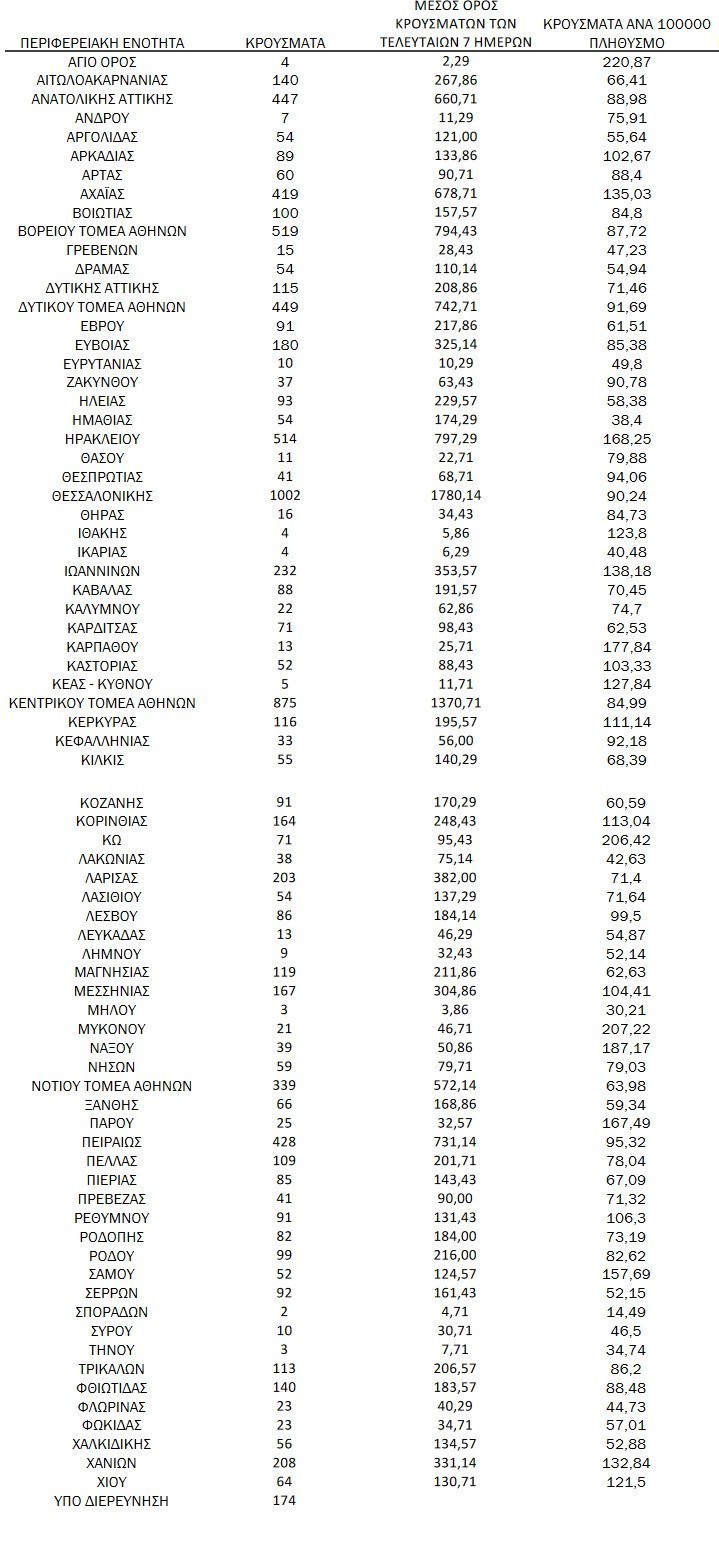 Η κατανομή των 9.553 νέων εγχώριων κρουσμάτων ανά Περιφερειακή Ενότητα παρουσιάζεται στον κατωτέρω πίνακα.