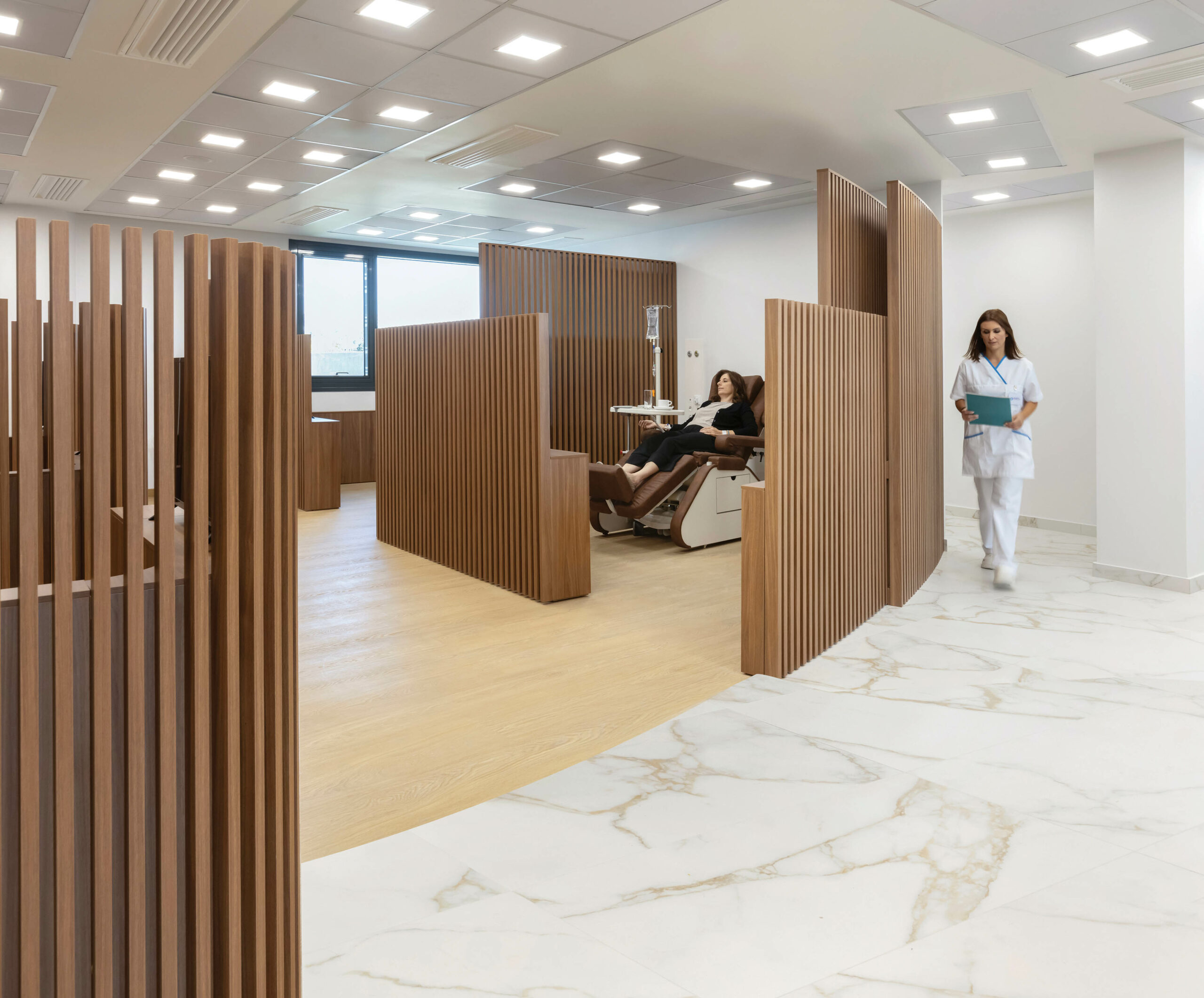 Το Κέντρο διαθέτει 120 υπερσύγχρονες κλίνες και θέσεις χημειοθεραπείας, σχεδιασμένες για να εξασφαλίζουν άνεση και ιδιωτικότητα, με εργονομικές, πλήρως ρυθμιζόμενες θέσεις που προσαρμόζονται στις ανάγκες κάθε ασθενούς καθ’ όλη τη διάρκεια της θεραπείας.