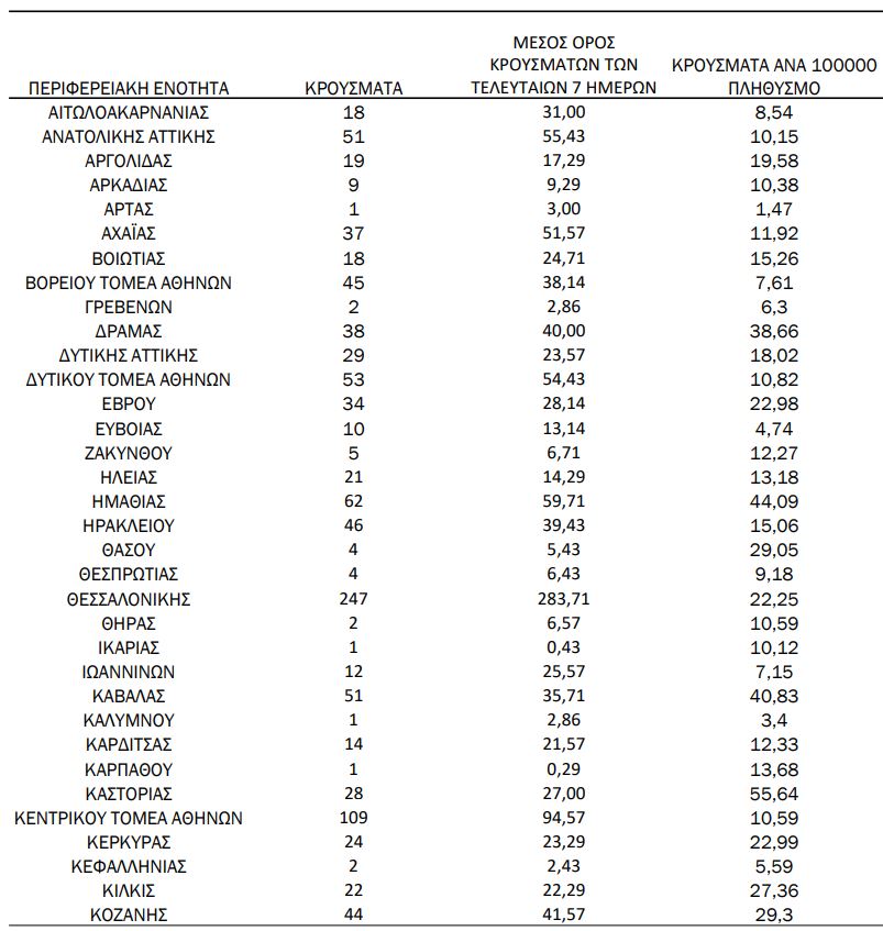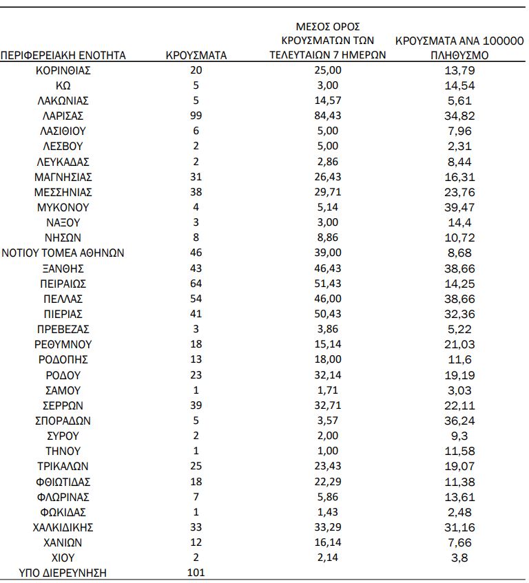 Με βάση τα επιβεβαιωμένα κρούσματα των τελευταίων 7 ημερών, 115 θεωρούνται σχετιζόμενα με ταξίδι από το εξωτερικό και 3.519 είναι σχετιζόμενα με ήδη γνωστό κρούσμα.
