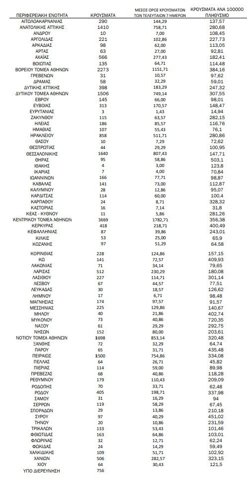 Η κατανομή των 23.746 νέων εγχώριων κρουσμάτων ανά Περιφερειακή Ενότητα παρουσιάζεται στον κατωτέρω πίνακα.