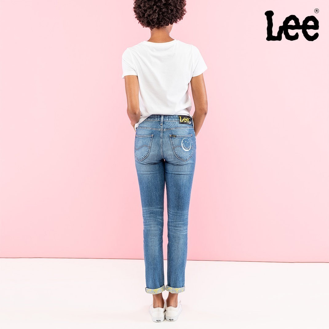 Για τις γυναίκες, επέλεξε δύο iconic fits -το skinny fit Scarlett και σήμα κατατεθέν της Lee, και το slim-cut Elly- και τα παρουσίασε σε ανοιχτόχρωμα, σταθερά υφάσματα εμπνευσμένα από τα ‘90s., στολίζοντάς τα με το happy face της Smiley.