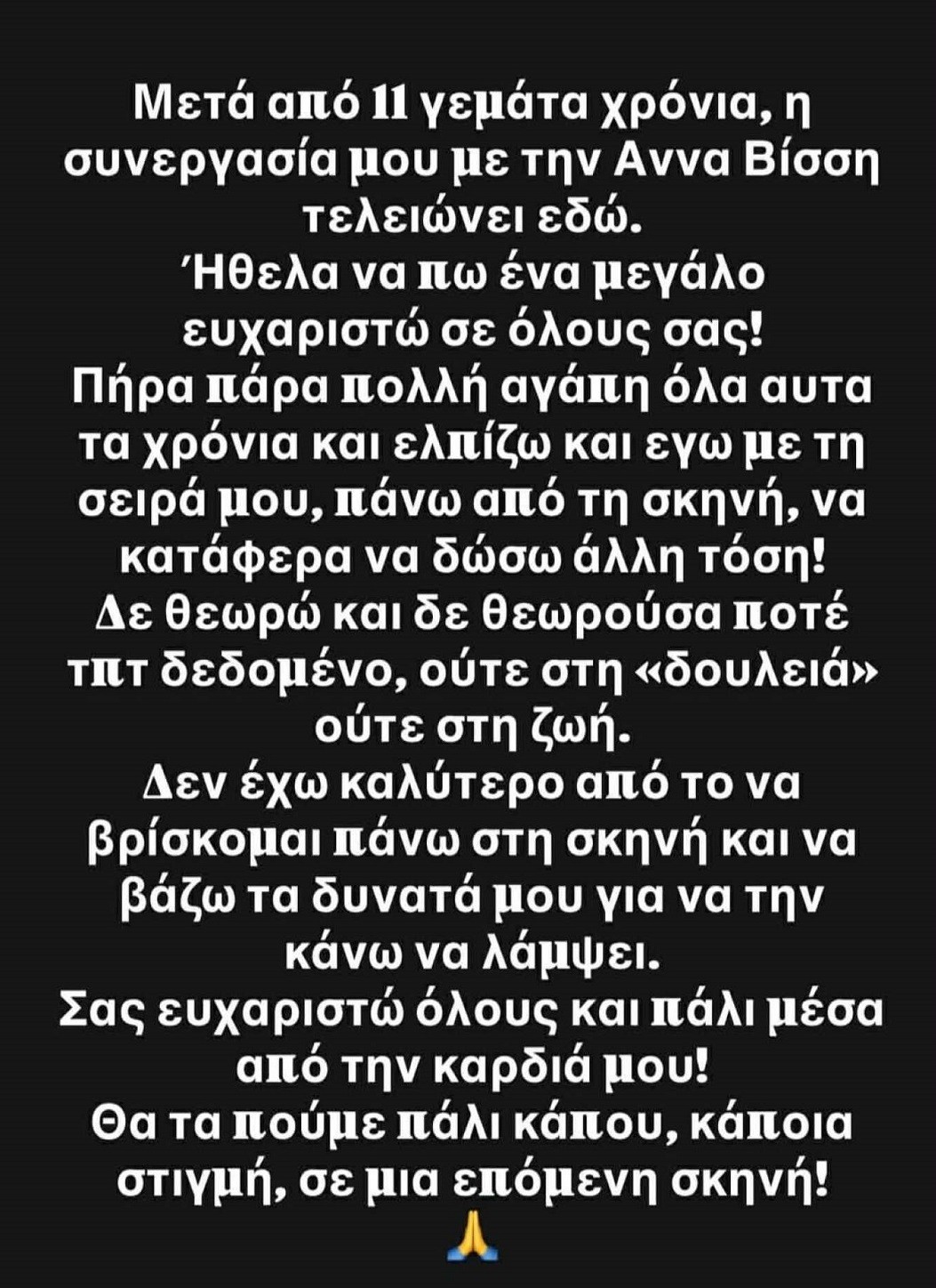 Ειδικότερα, αναφέρει ότι «Μετά από 11 γεμάτα χρόνια, η συνεργασία μου με την Άννα Βίσση τελειώνει εδώ. Ήθελα να πω ένα μεγάλο ευχαριστώ σε όλους σας! Πήρα πάρα πολύ αγάπη όλα αυτά τα χρόνια και ελπίζω και εγώ με τη σειρά μου, πάνω από τη σκηνή, να κατάφερα να δώσω άλλη τόση!