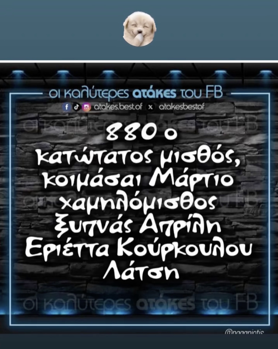«880 ευρώ ο κατώτατος μισθός. Κοιμάσαι Μάρτιο χαμηλόμισθος, ξυπνάς Απρίλη Εριέττα Κούρκουλου Λάτση» έγραψε ένας χρήστης στο Twitter (X), με το tweet να γίνεται viral.