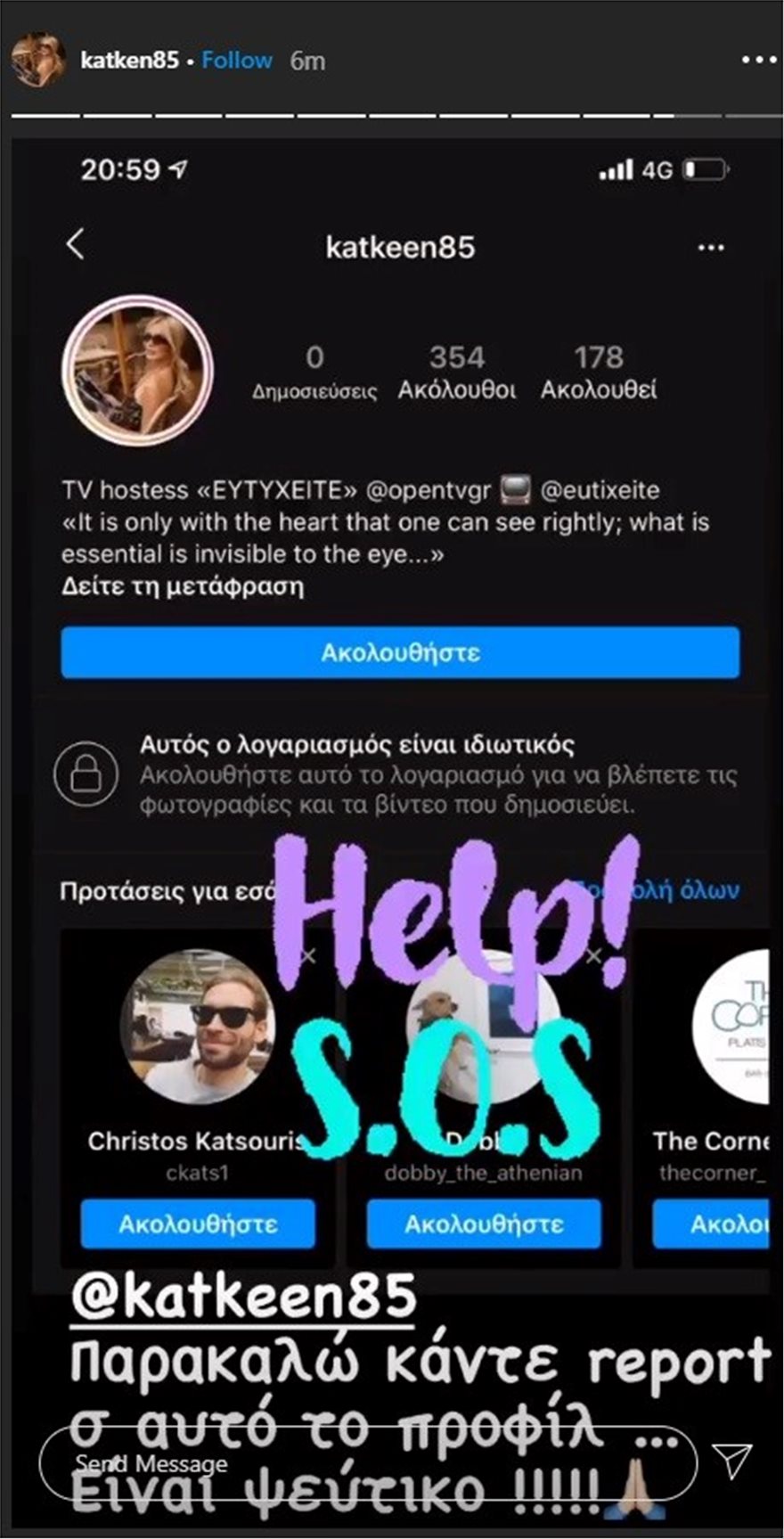 Η Κατερίνα Καινούργιου κοινοποίησε τόσο το ψεύτικο αυτό προφίλ, όσο και το μήνυμα στον δικό της λογαριασμό, ζητώντας από τους διαδικτυακούς της φίλους να κάνουν αναφορές.