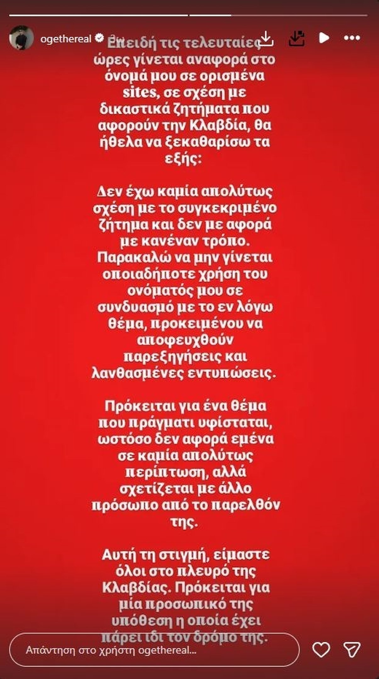 Με ανάρτησή του, στην ουσία επιβεβαιώνει τη δικαστική διαμάχη της Klavdia, η οποία τηρεί σιγή ιχθύος και δεν έχει τοποθετηθεί ακόμα δημόσια.
