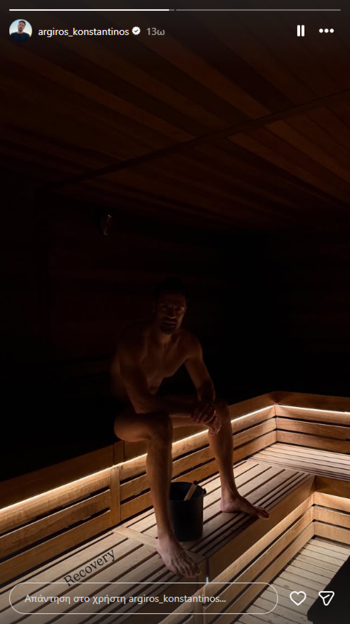 Συγκεκριμένα, ο τραγουδιστής ανέβασε συγκεκριμένα ένα story στο προφίλ του την Κυριακή 22 Φεβρουαρίου, από τη στιγμή που χαλαρώνει μέσα σε μία σκοτεινή σάουνα, ημίγυμνος, κοιτάζοντας την κάμερα.