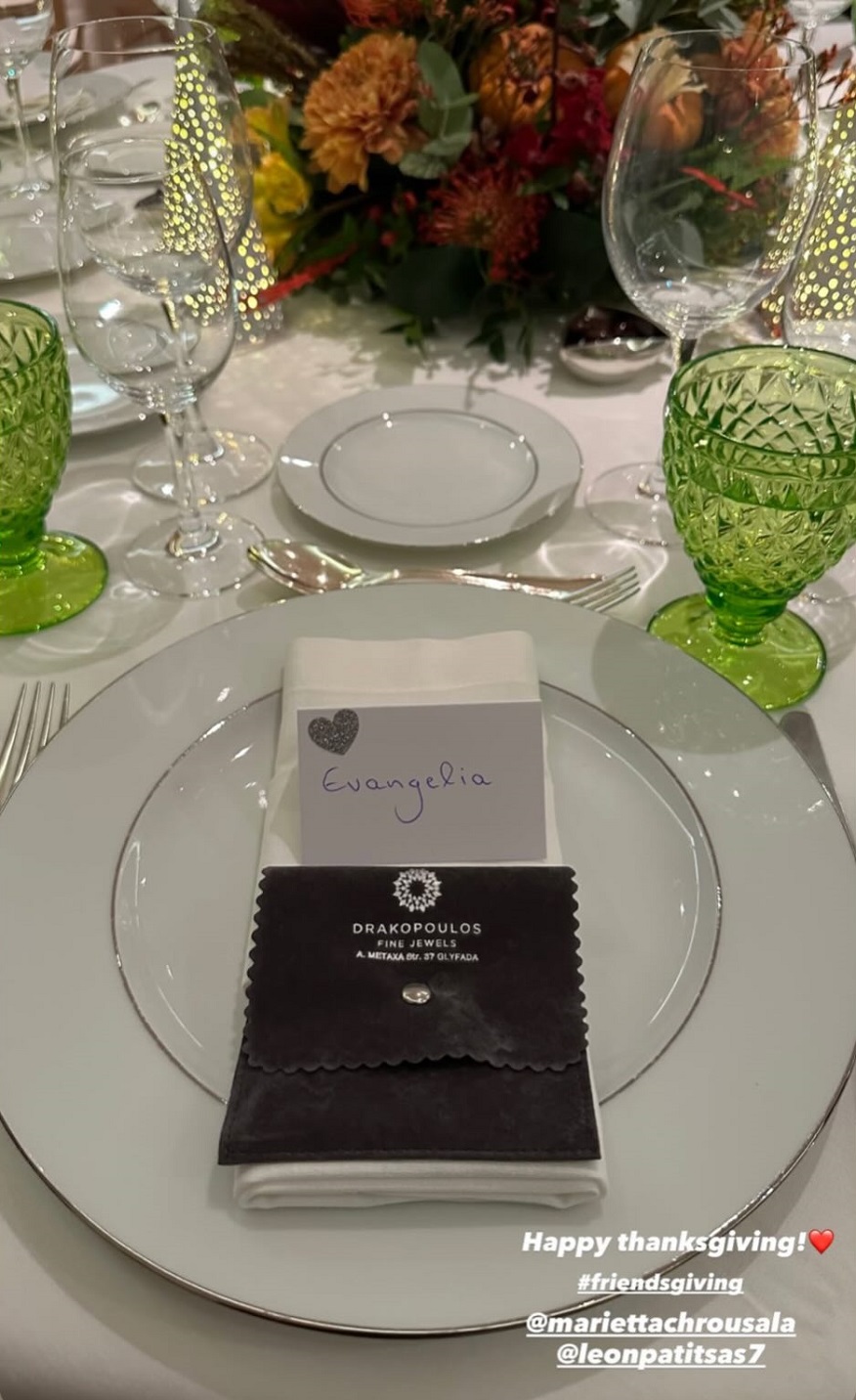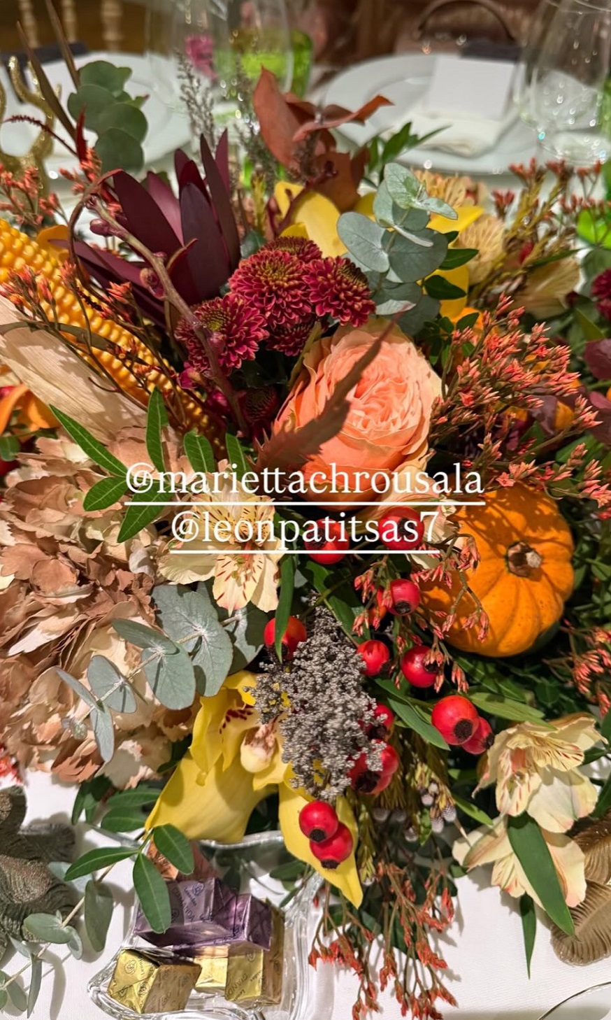 Με αφορμή την Ημέρα των Ευχαριστιών, η Μαριέττα Χρουσαλά και ο εφοπλιστής Λέων Πατίτσας παρέθεσαν ένα δείπνο για στενούς φίλους τους στην οικία τους στο Ελληνικό.