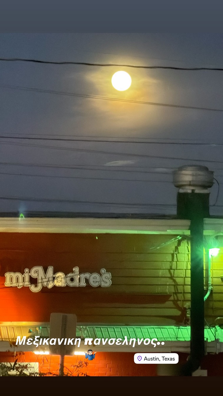 Το βράδυ της Δευτέρας, απόλαυσαν το δείπνο τους στο μεξικάνικο εστιατόριο mi Madre’s, με τον Κωστόπουλο να φωτογραφίζει το φεγγάρι και να γράφει: «Μεξικάνικη πανσέληνος».