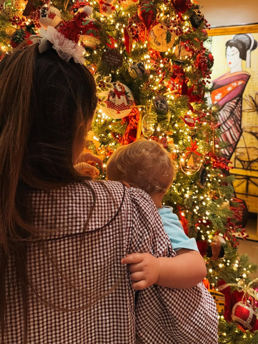 Σε μία από τις φωτογραφίες, η μαμά Εριέττα κρατάει στην αγκαλιά της τον μικρό Λέοντα μπροστά στο χριστουγεννιάτικο δέντρο τους.