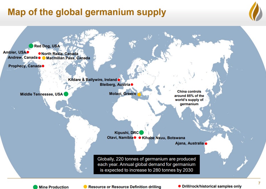 Παράλληλα, υπάρχει και στοχευόμενος πόρος γερμανίου, που εκτιμάται μεταξύ 4,5 και 6 εκατομμυρίων τόνων μεταλλεύματος, με περιεκτικότητα 17 έως 25 γραμμάρια γερμανίου ανά τόνο. Σημειώνεται ότι σήμερα πακοσμίως παράγονται συνολικά 220 τόνοι γερμανίου ανά έτος, ενώ η παγκόσμια ζήτηση αναμένεται να φτάσει τους 280 τόνους έως το 2030, καθιστώντας τη διαφοροποίηση της παραγωγής ιδιαίτερα σημαντική.