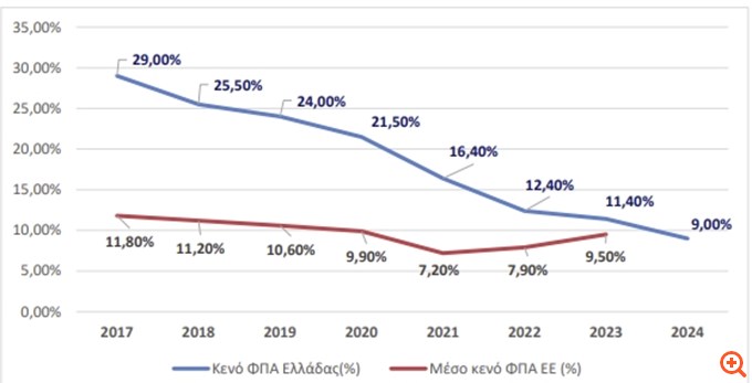 Η πτωτική τάση του κενού ΦΠΑ στην Ελλάδα συνεχίζεται, με τις προκαταρκτικές εκτιμήσεις για το 2024 να προβλέπουν περαιτέρω μείωσή του στο 9,0%.