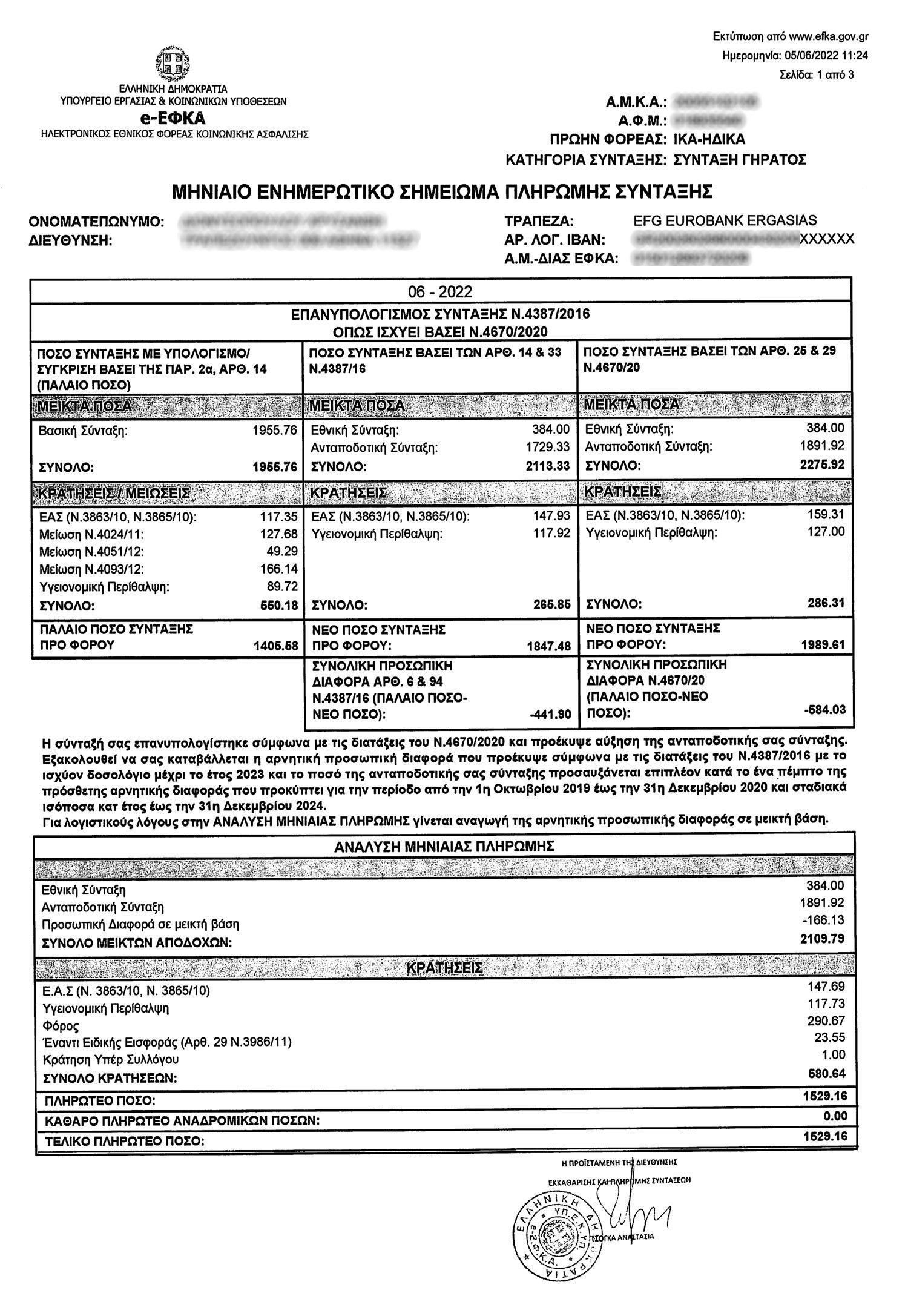 Σύμφωνα με τον «Νόμο Κατρούγκαλου» (ν.4387/16): Η ανταποδοτική σύνταξη ήταν 985 ευρώ και αυξήθηκε στα 1.729,33 ευρώ. Πρόκειται για αύξηση 744,33 ευρώ