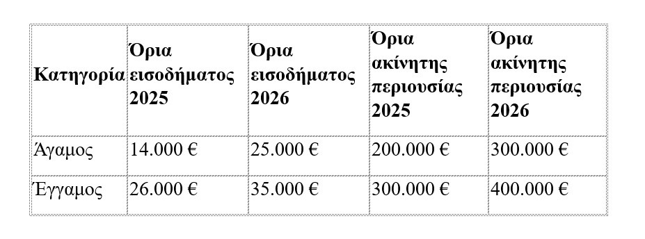 Κρίσιμο στοιχείο της παρέμβασης είναι η αναπροσαρμογή των ορίων εισοδήματος και ακίνητης περιουσίας, τα οποία αυξάνονται αισθητά σε σχέση με το προηγούμενο καθεστώς. Ειδικότερα, για τους άγαμους συνταξιούχους το όριο οικογενειακού εισοδήματος αυξάνεται από 14.000 σε 25.000 ευρώ, ενώ για τους έγγαμους από 26.000 σε 35.000 ευρώ. Αντίστοιχα, τα όρια ακίνητης περιουσίας διαμορφώνονται πλέον στις 300.000 ευρώ για τους άγαμους (από 200.000 ευρώ προηγουμένως) και στις 400.000 ευρώ για τους έγγαμους (από 300.000 ευρώ).