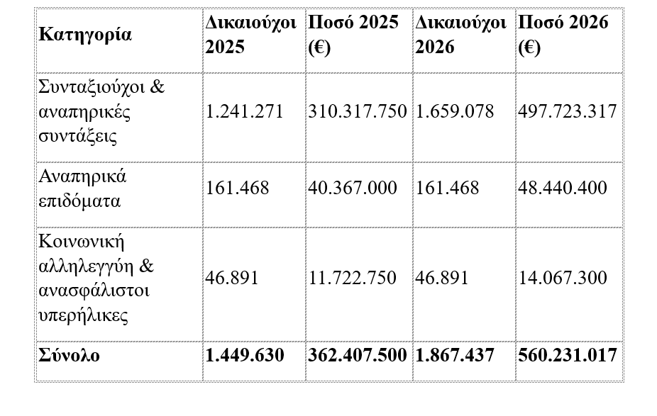 Παράλληλα, αυξάνεται σημαντικά και το συνολικό κονδύλι που διατίθεται για την ενίσχυση. Από περίπου 362 εκατ. ευρώ το 2025, το ποσό εκτοξεύεται σε πάνω από 560 εκατ. ευρώ το 2026.