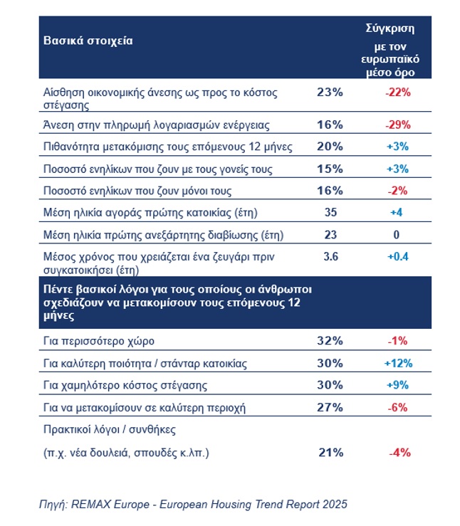 Ωστόσο, περίπου ένας στους τρεις Έλληνες (27%) δυσκολεύεται να ανταποκριθεί στο κόστος της τωρινής του κατοικίας, έναντι 17% στο σύνολο των Ευρωπαίων, ενώ ακόμα περισσότεροι Έλληνες (34%) αντιμετωπίζουν δυσκολίες για τους λογαριασμούς ενέργειας (στην Ευρώπη το ποσοστό είναι 16%). Επίσης, περίπου ένας στους δέκα (11%) ξοδεύει πάνω από το 50% του εισοδήματός του σε στέγαση και λογαριασμούς, κάτι που επηρεάζει αρνητικά τα επίπεδα στεγαστικής ικανοποίησης.