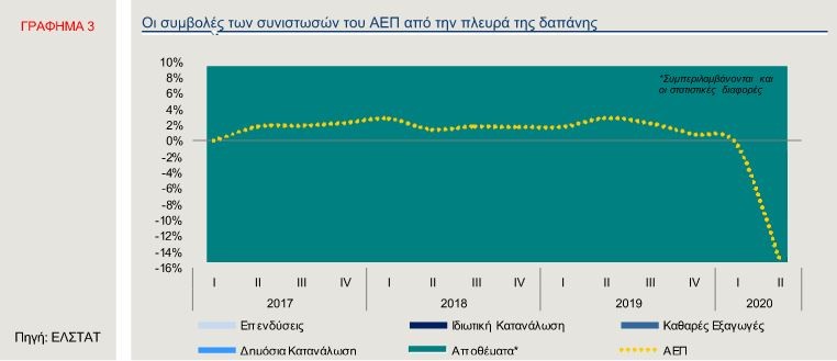 Η μεγάλη πτώση που κατεγράφη στο δεύτερο τρίμηνο του 2020 κατά 15,2% σε ετήσια βάση (14% σε τριμηνιαία βάση) αντανακλά την πρωτοφανή επίπτωση της πανδημικής κρίσης στην εγχώρια οικονομία, μετά την αναστολή της οικονομικής δραστηριότητας στην πλειονότητα των κλάδων τον Απρίλιο, αλλά και την «υπολειτουργία» ενός μεγάλου μέρους των επιχειρήσεων τον Μάιο και τον Ιούνιο.