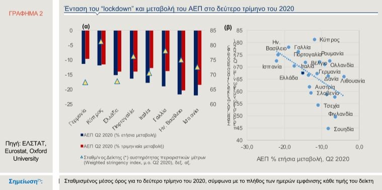 Το βασικό συμπέρασμα που προκύπτει είναι ότι, όσο πιο αυστηρά ήταν τα μέτρα που υιοθετήθηκαν στο διάστημα αυτό, προκειμένου να περιοριστεί η εξάπλωση της πανδημίας, τόσο μεγαλύτερη ήταν η πτώση του ΑΕΠ του δεύτερου τριμήνου, σε ετήσια βάση. Ωστόσο, θα πρέπει να επισημανθεί ότι υπάρχουν πρόσθετοι παράγοντες που σχετίζονται με την υγειονομική κρίση και επηρέασαν το μέγεθος της συρρίκνωσης της οικονομικής δραστηριότητας, όπως η σφοδρότητα με την οποία επλήγη κάθε χώρα από την πανδημία (π.χ. η Ιταλία, η Ισπανία, η Γαλλία και το Ηνωμένο Βασίλειο είναι μεταξύ των χωρών με το μεγαλύτερο αριθμό καταγεγραμμένων κρουσμάτων παγκοσμίως), ή η υποδομή του συστήματος υγείας (π.χ. στη Γερμανία το ποσοστό θνητότητας είναι συγκριτικά χαμηλό, λόγω -μεταξύ άλλων- του υψηλού αριθμού κλινών ΜΕΘ που διαθέτει η χώρα).