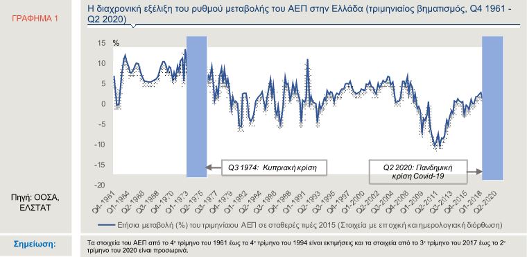 Η συρρίκνωση του ΑΕΠ στο δεύτερο τρίμηνο του 2020, ως αποτέλεσμα του lockdown, είναι υψηλότερη ακόμη και σε σχέση με την αντίστοιχη πτώση που κατεγράφη στο τρίτο τρίμηνο του 1974 (-12,9%) και συνδεόταν με την τουρκική εισβολή στην Κύπρο και την επιστράτευση τον Ιούλιο του 1974 (Γράφημα 1). Συνολικά, το πρώτο εξάμηνο του έτους, το ΑΕΠ μειώθηκε κατά 7,9%, σε ετήσια βάση, έναντι αύξησης 2,3% το πρώτο εξάμηνο του 2019.