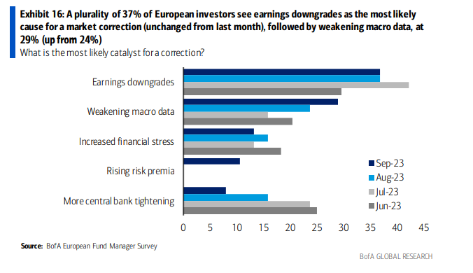 Το 84% βλέπει πτωτική τάση για τα κέρδη ανά μετοχή στις ευρωπαϊκές μετοχές ως απάντηση στην επιβράδυνση της ανάπτυξης και την εξασθένιση του πληθωρισμού, με το 37% να θεωρεί την υποβάθμιση των κερδών ως την πιο πιθανή αιτία διόρθωσης της αγοράς, ακολουθούμενη από την αποδυνάμωση των μακροοικονομικών δεδομένων, με 29%.