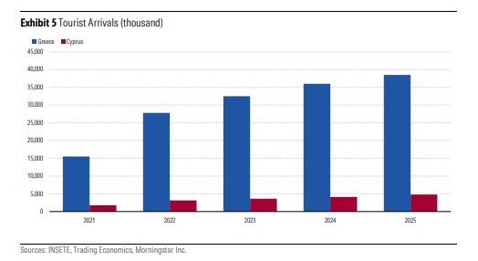 Τόσο η Ελλάδα όσο και η Κύπρος έχουν σημειώσει ρεκόρ αφίξεων τουριστών τα τελευταία χρόνια (Διάγραμμα 5).